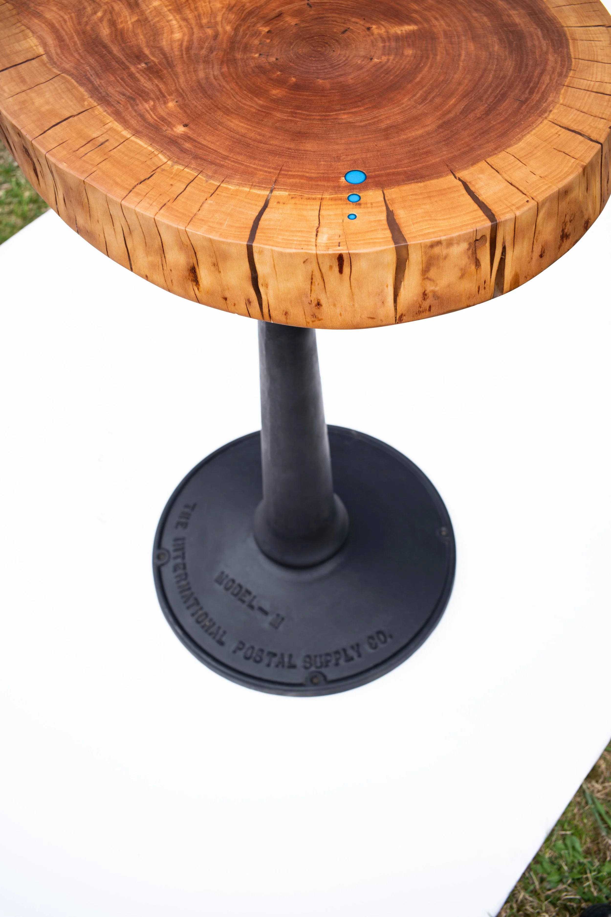 Close-up view of a wooden table with a natural, uneven edge and a visible knot, mounted on a black stand.