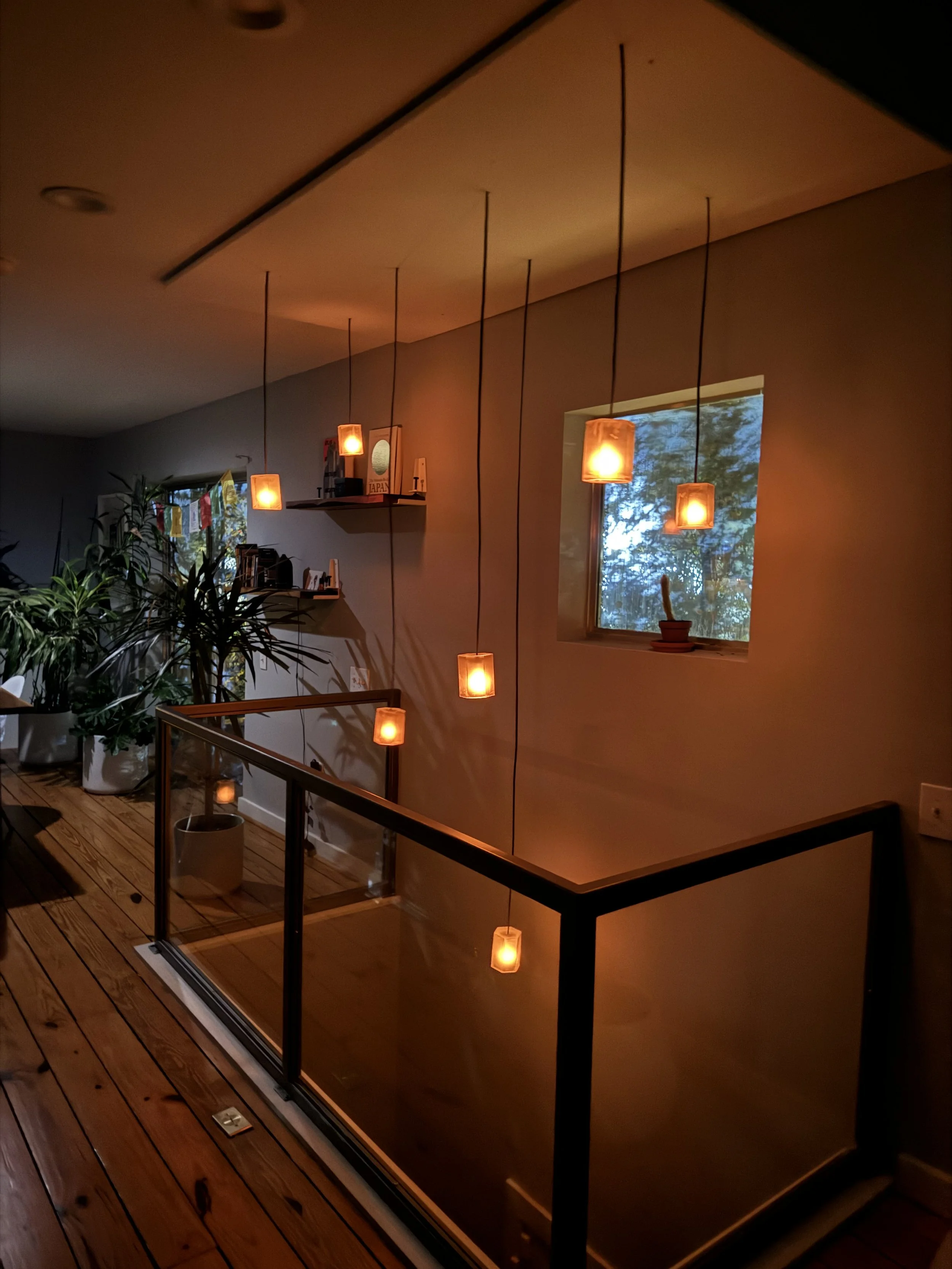 Indoor space with hanging orange pendant lights, a railing, a small window with a view of trees, potted plants, and wooden flooring.