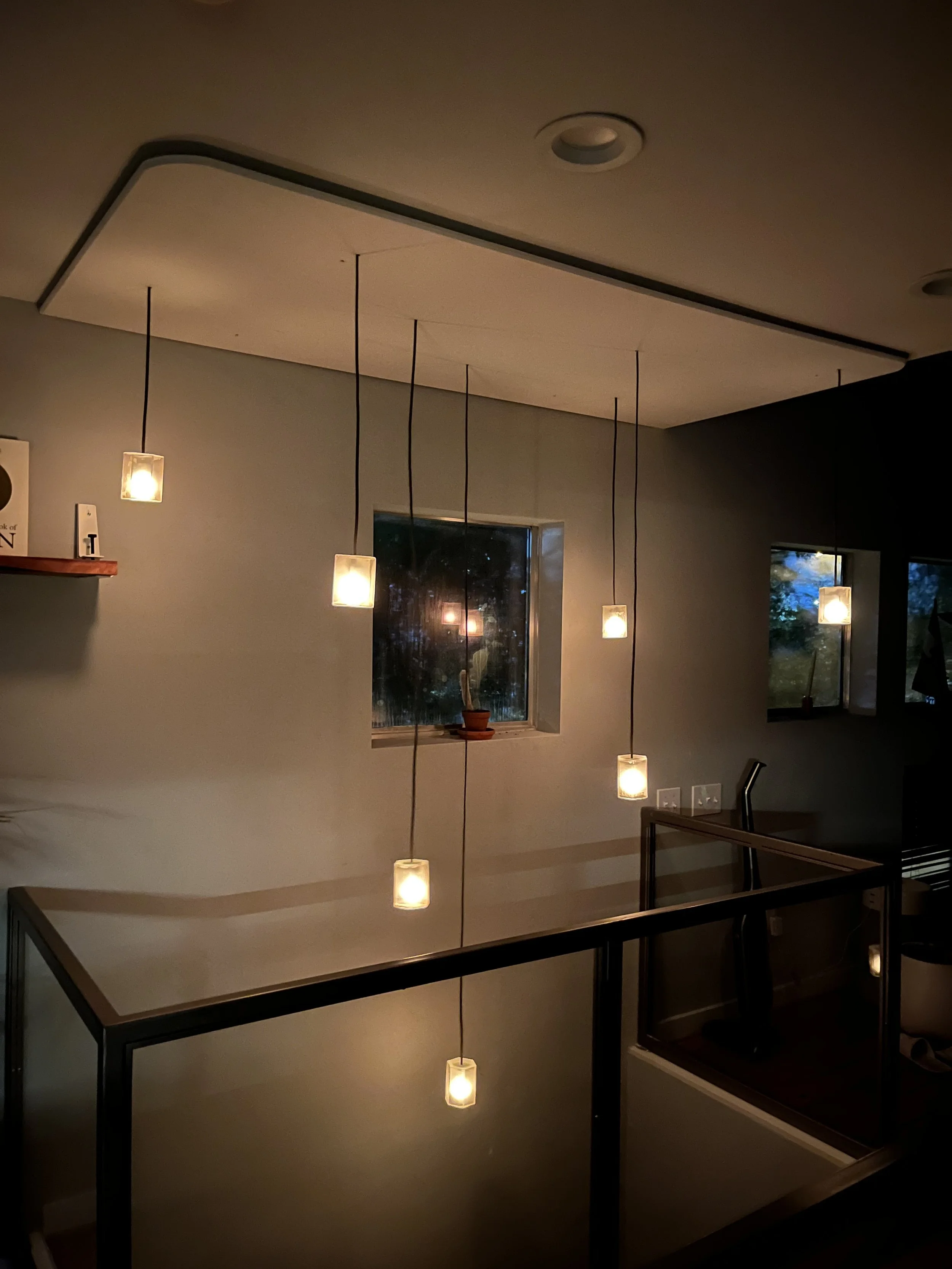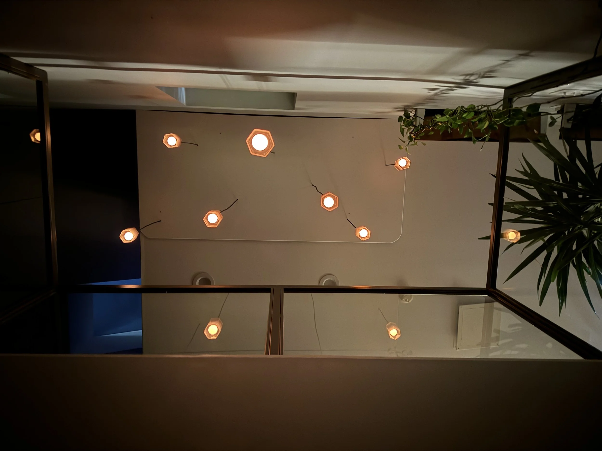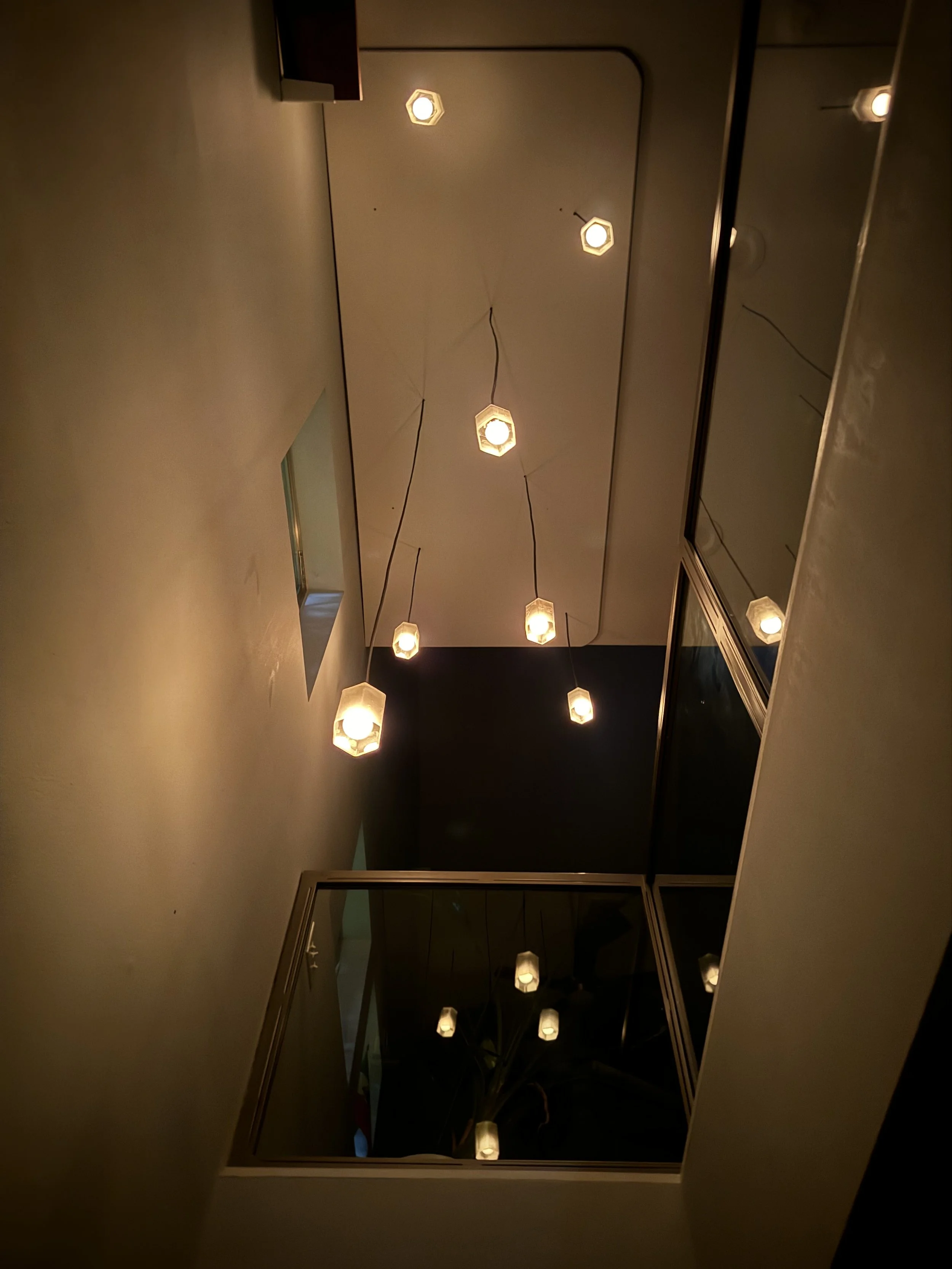 Ceiling with electric lights in orange shades, some visible plants, and glass panels reflecting the lights.
