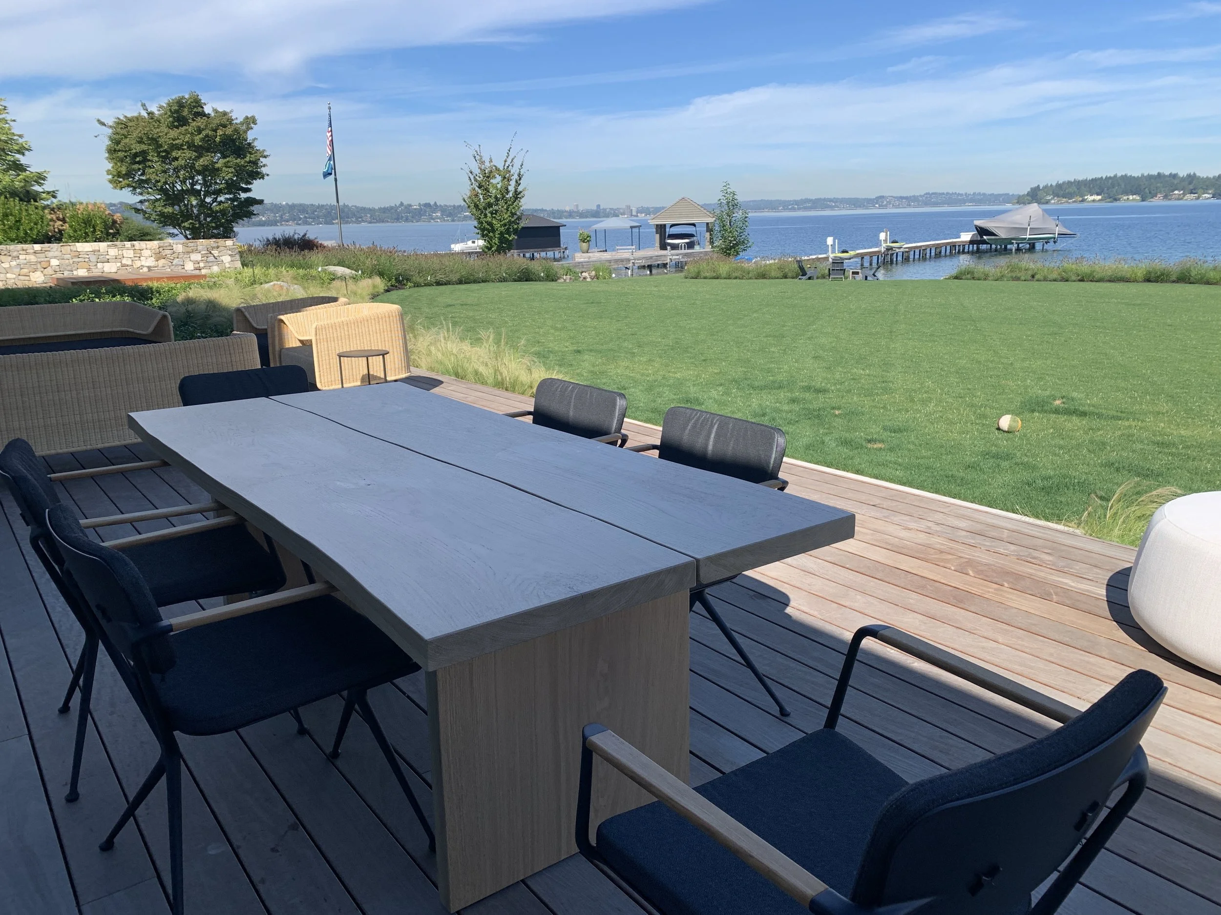 Outdoor patio with a wooden dining table and black chairs, overlooking a grassy yard and a large body of water with a dock, boat, and small pavilion in the distance.